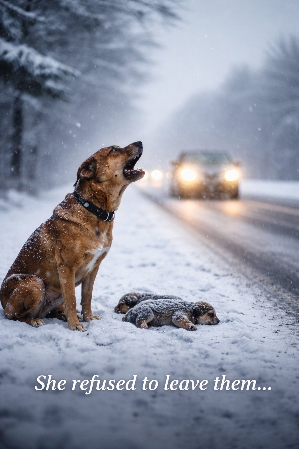 The mother lowered her body over them, trying to block the wind. Snow gathered on her fur. Her eyes were tired, but they never stopped scanning the road.